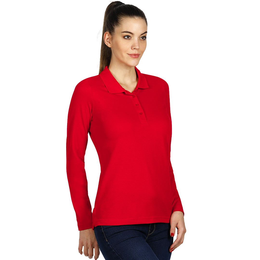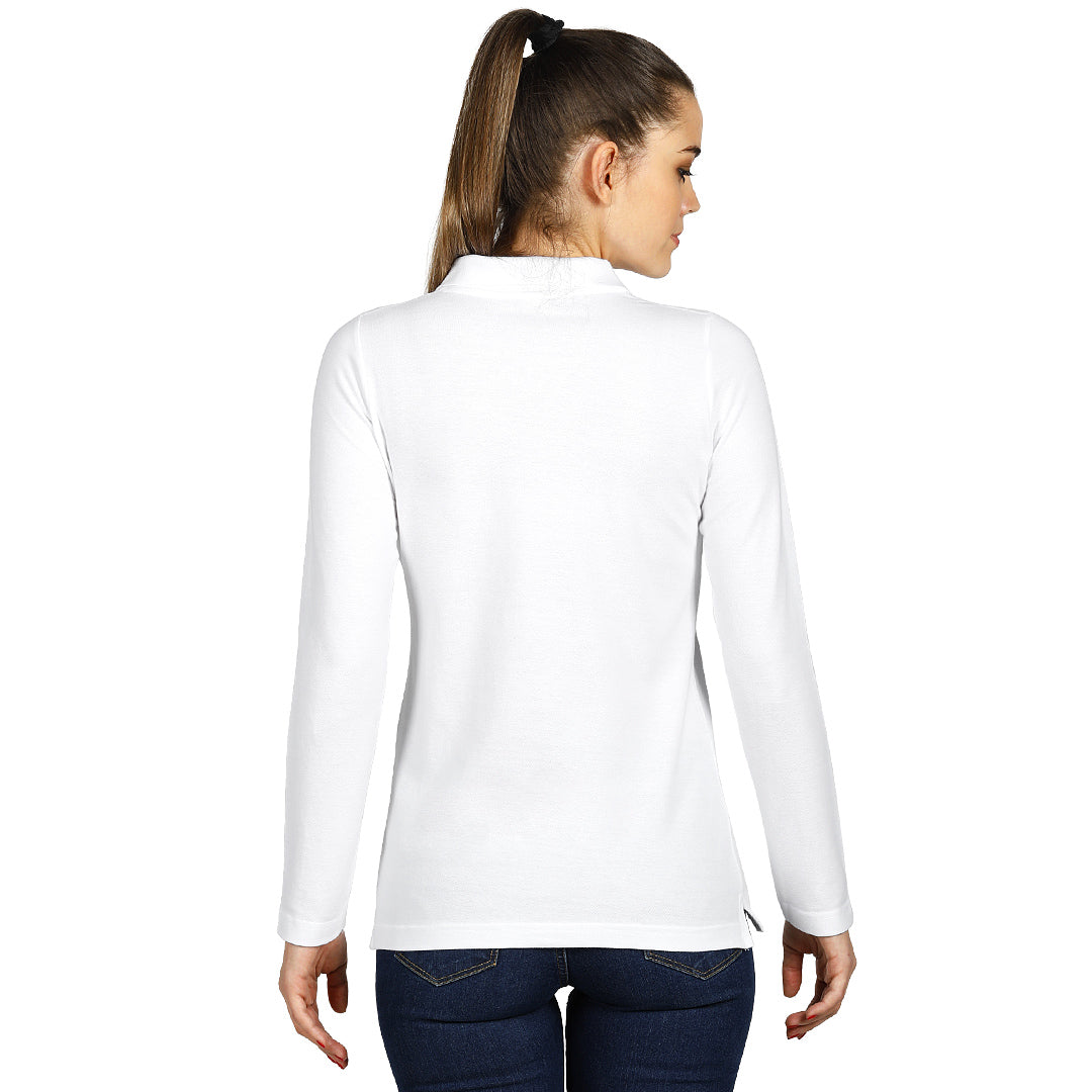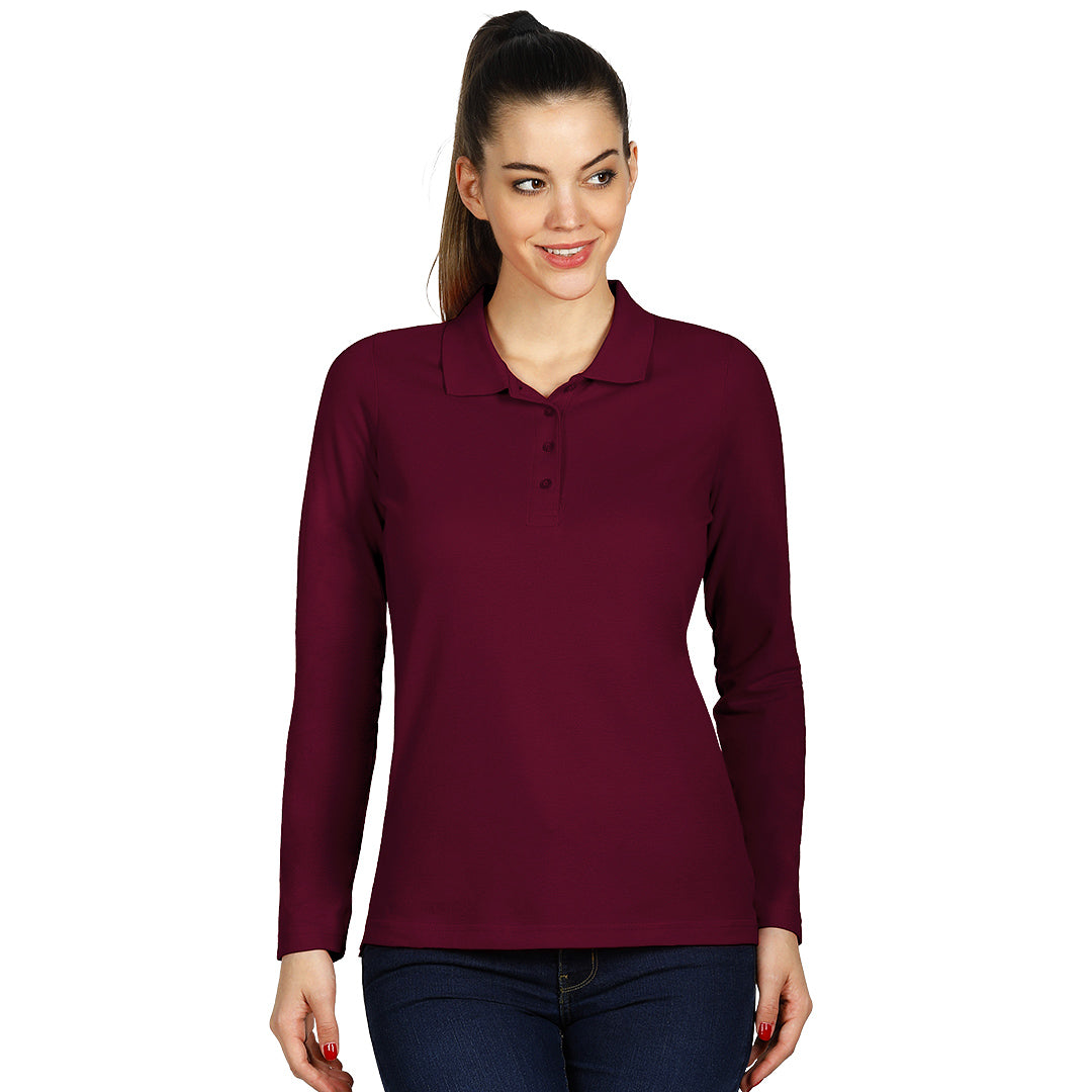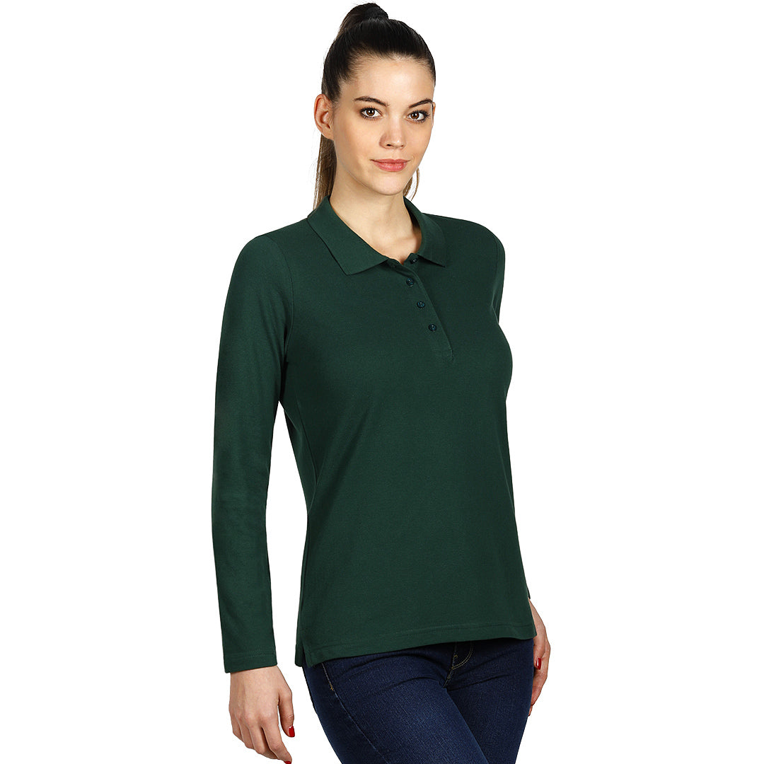 Ženska polo majica dugih rukava, 200 g/m2, blago strukirana, šivena sa strane, dupli štepovi na rukavima i dnu, četiri dugmeta u boji majice, rezervno dugme, dodatni štep duž ramena, okovratnik ojačan trakom, šlicevi sa strane.