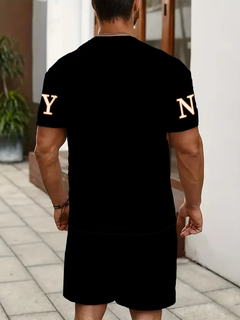 Evropski i američki letnji modni set majica za muškarce, novi set sa 3D digitalnim printom u boji slova, klasičan okrugli izrez, udoban i opušten set, kratki rukavi i šorts, dvodelni set.