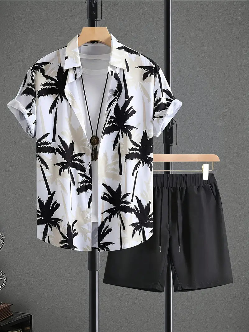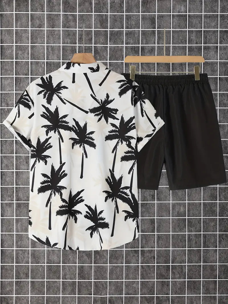 Set za muškarce sa štampanim kokosovim palmama - Beli sa crnim i roze dizajnom, lagani materijal koji se ne streča, savršen za letnje aktivnosti na otvorenom, plažni stil, Tropski stil, Kratki rukav