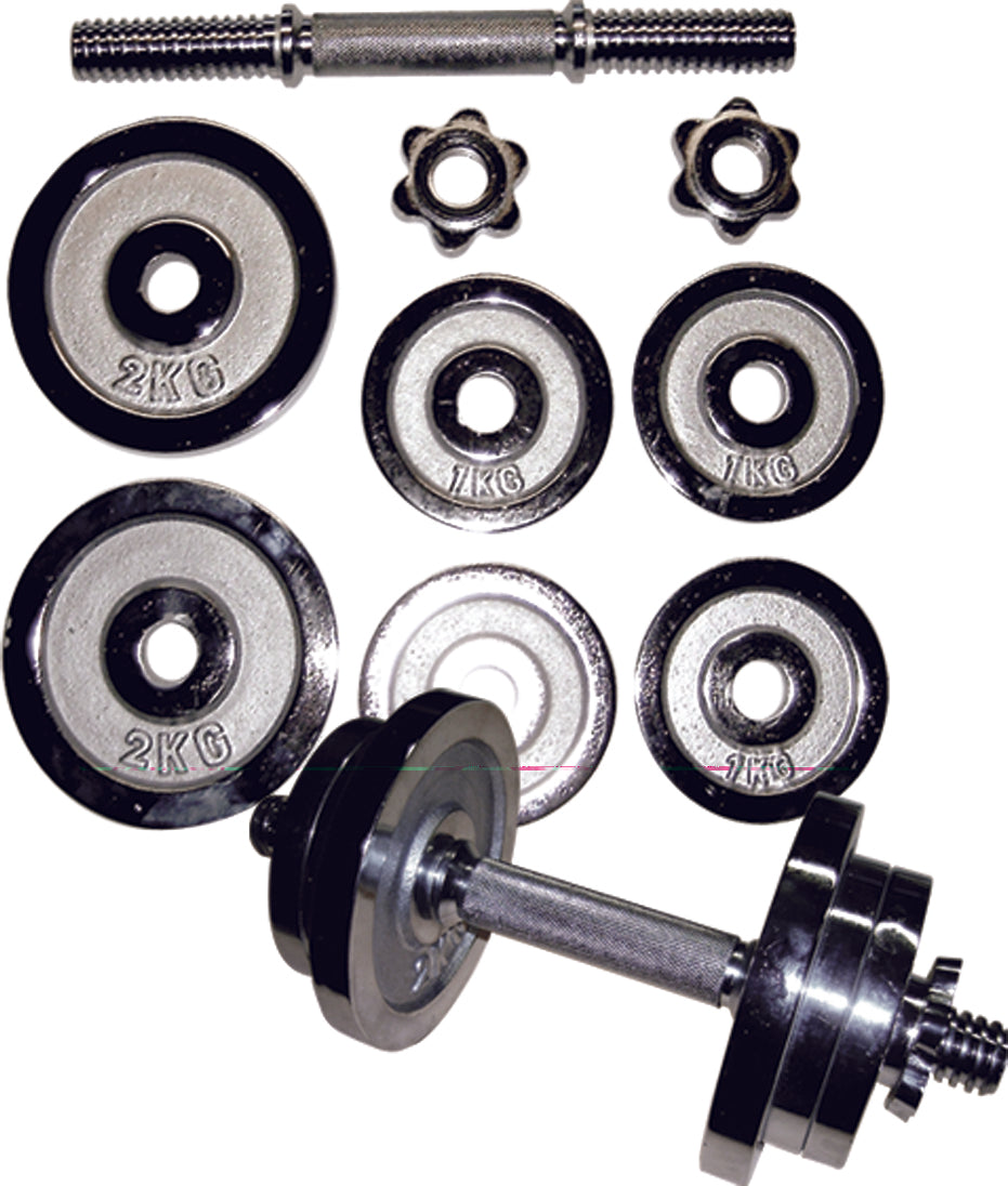 Set hromiranih tegova ukupne težine 10kg. Set se sastoji iz šipke, 2 tega od po 2 kg, 4 tega od po 1 kg i 2 stege.