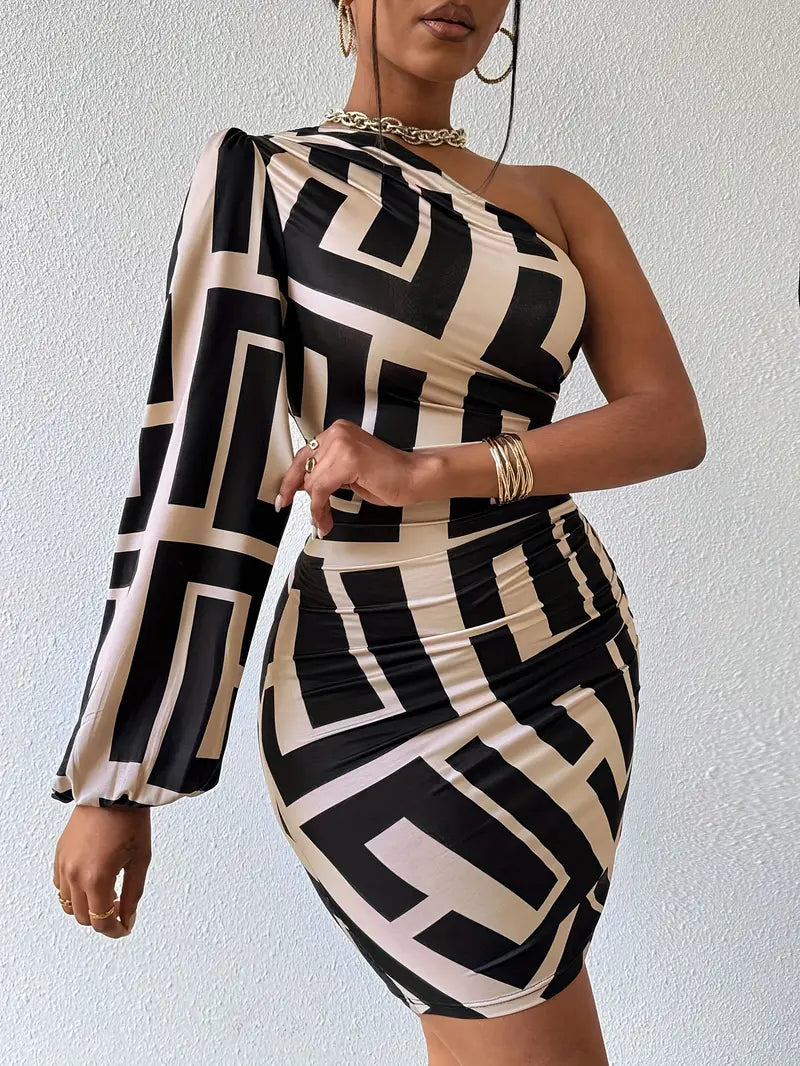 1 komad ženske haljine sa geometrijskim uzorkom, seksi asimetrični izrez, pletenina od poliestera, dizajn sa jednim ramenom, pogodna za sve sezone.